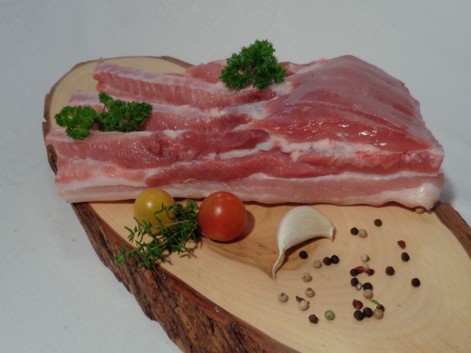 Magerer Schweinebauch ohne Rippen mit Schwarte. Der Schweinebauch eignet sich zum Kochen als herzhafte Fleischeinlage, zum Grillen oder gefüllt als Braten.